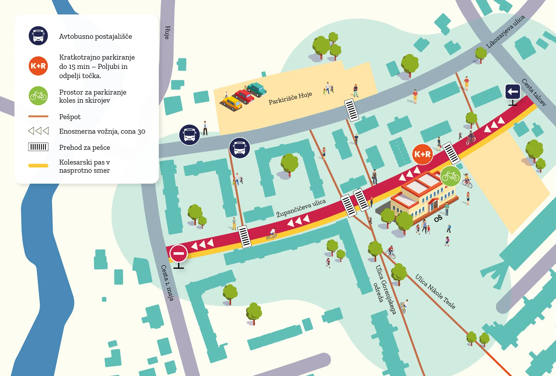 Nov prometni režim prinaša spremenjeno smer vožnje po enosmerni ulici, torej tistem delu Župančičeve ulice, ki poteka mimo šole. Promet bo odslej potekal od Ceste talcev proti Cesti 1. maja, kar bo pripomoglo k zmanjšanju tranzitnega prometa v tem območju.